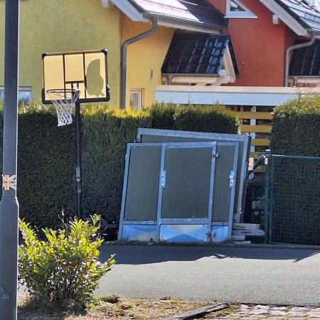 seit Monaten lehnt im Rosenweg linker Wendehammer ein großes, schweres Garagentor an einem Maschendrahtzaun.