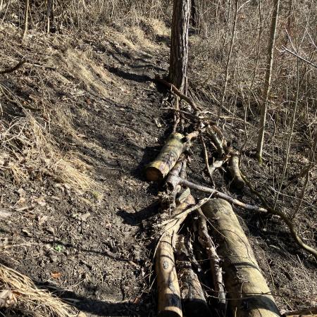 Weg Richtung Einsiedlerberg bei Ilmnitz. Wir hatten vor Monaten den Wanderweg mit Baumstämmen und großen Ästen halbwegs begehbar gemacht. Leider fanden dies die Wildschweine gar nicht gut und haben den Weg zerpflückt Der Weg hat jetzt wieder eine Schräglage das besonders bei aufgeweichten Boden ein Begehen schmierig ist. Man müsste da mal mit Spitzhacke oder Spaten den Weg begradigen.