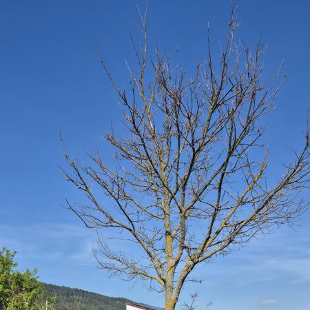 Hallo, der abgebildete Kirschbaum (städtisch mit grüner Marke) wächst in unseren Betriebsgelände-Zaun. Bitte den Baum schneiden/fällen da der Zaun sonst komplett zerstört wird.