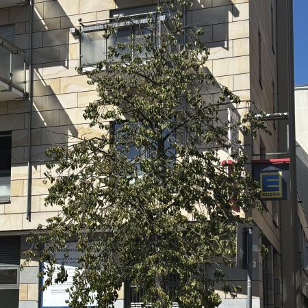 Die kleinen Bäume in den Kübeln vor dem Intershop-Tower verdursten.