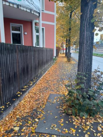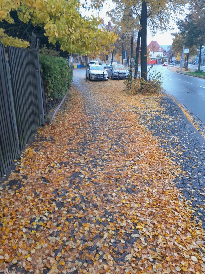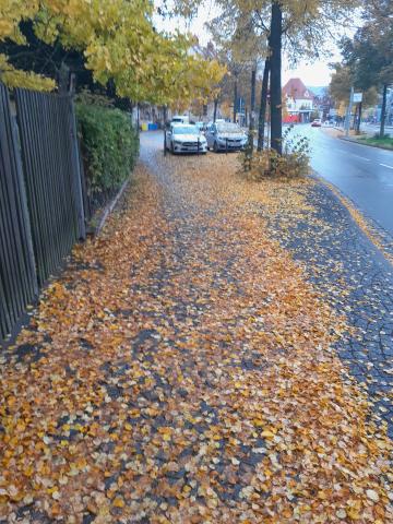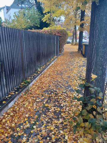 Der Gehweg ist so von Laub übersät das hier Rutschgefahr besteht. Bitte die Kehrung veranlassen.