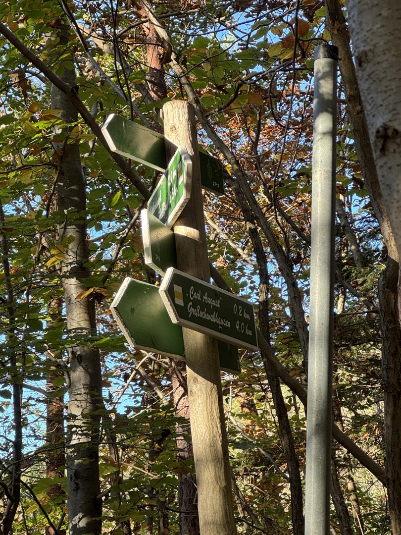 Bild 2 befindet sich an einer Weggablung im Mühltal auf der Horizontale von den Perückensträuchern kommend Richtung Zigeunerquelle, die Beschilderung dort zeigt einen Pfeil, der nach links Richtung Carl August 0,2 km weist, doch der Weg endet im Unterholz und keineswegs wie angezeigt. Alternative umkehren oder mühsam am Graben neben der B 88 entlang schleichen, um zum angezeigten Ziel zu gelangen