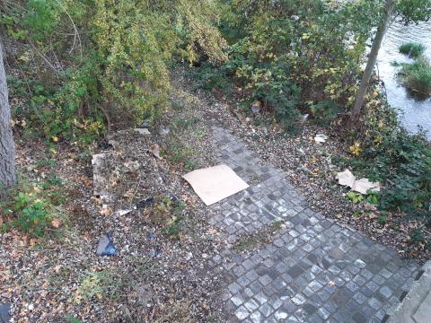 Unter der Paradiesbrücke (stadteinwärts rechte Seite, von der Brücke aus sichtbar) großer, mit Zweigen abgedeckter Müllhaufen. Daneben weiterer Müll wie Kartons etc.