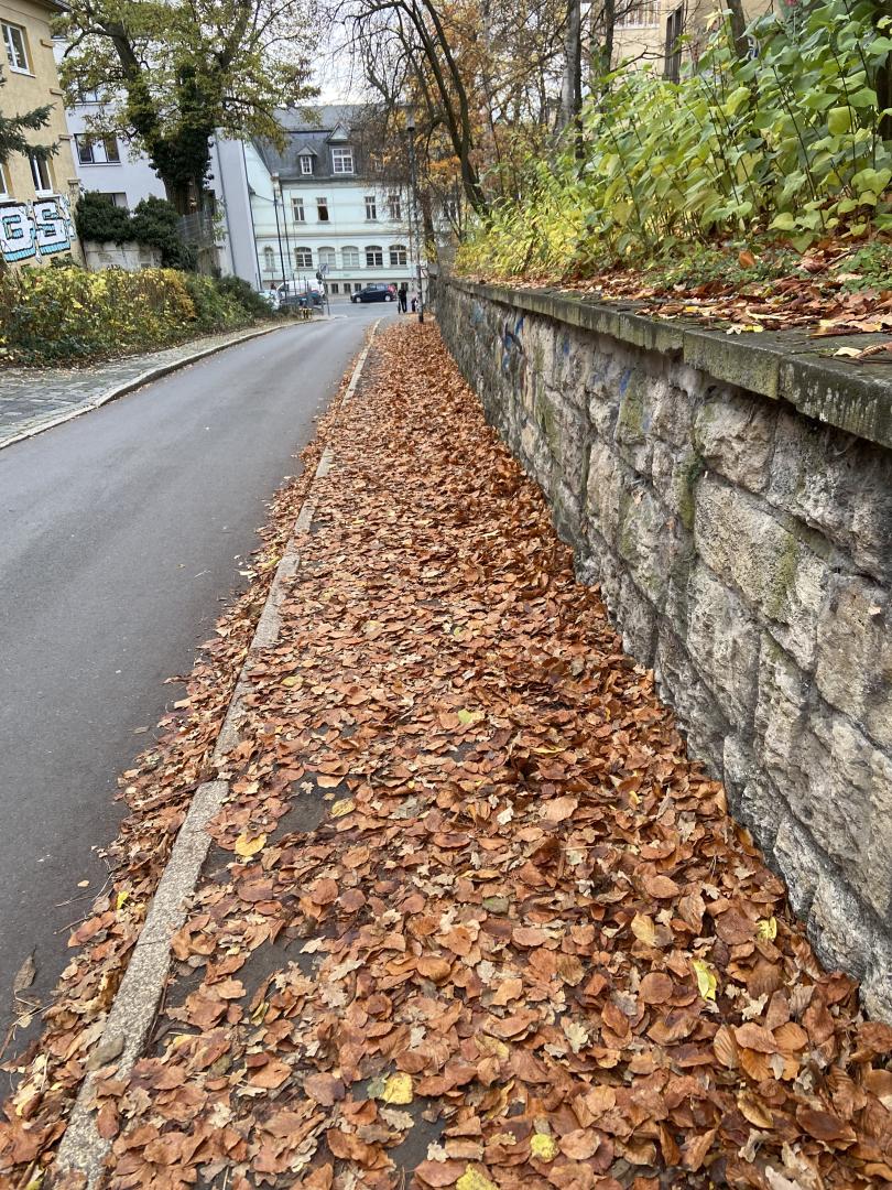 Der Fußweg in der Kochstraße ist aufgrund des sehr hoch und dicht liegenden Laubs auf dem Gehweg nicht gut und für Kinder und Kinderwagen schwer begehbar. Bei nasser Witterung entsteht erhöhte Rutschgefahr.
