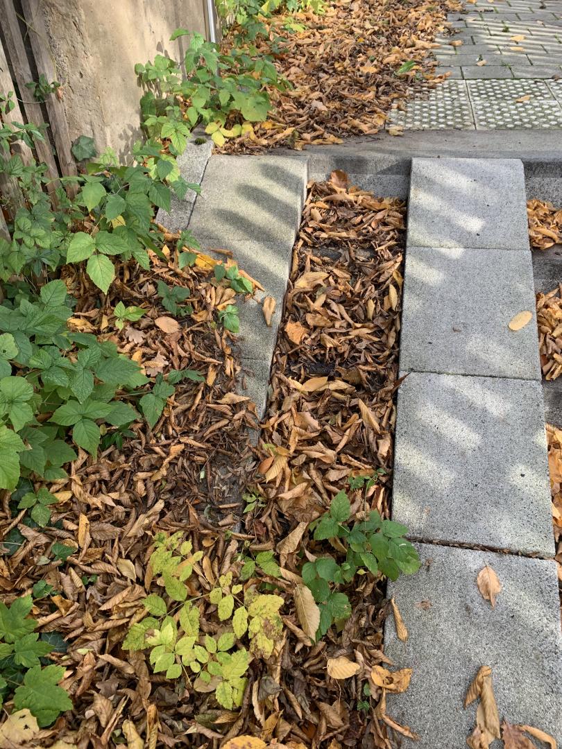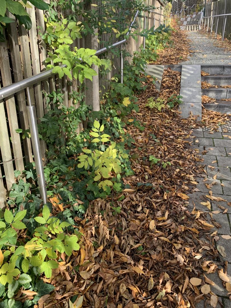 Der Magaretenweg in Jena-Ost liegt voller Blätter, die Kinderwagenspur ist kaum noch zu sehen,weiterhin wachsen am Rand Eschen (bisher sind sie noch relativ klein, aber nicht mehr lange).