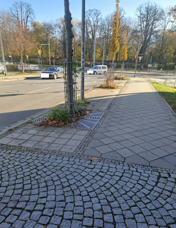 Das ist ein üblicher und von allen Verkehrsteilnehmern erwartbarer Zustand. Die Baumscheibe ist klar als solche erkennbar, die Restgehwegbreite als eine der wenigen in Jena überhaupt mal in Normbreite - aber irgendjemand möchte auch auf Baumscheiben herumlaufen und andere in die Verantwortung nehmen, wenn er ausrutscht...