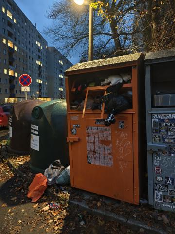Der Altkleider-Container ist überfüllt.