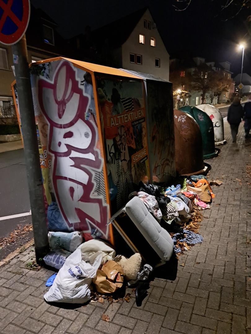 hinter den Altkleidercontainern Am Steinborn/Ecke Drosselstraße liegen seit geraumer Zeit etliche Müllsäcke. Der ohnehin schon schmale Bürgersteig wird hier noch weiter eingeschränkt. Auch aus Sicherheitsgründen bitte ich um Beseitigung des Mülls.