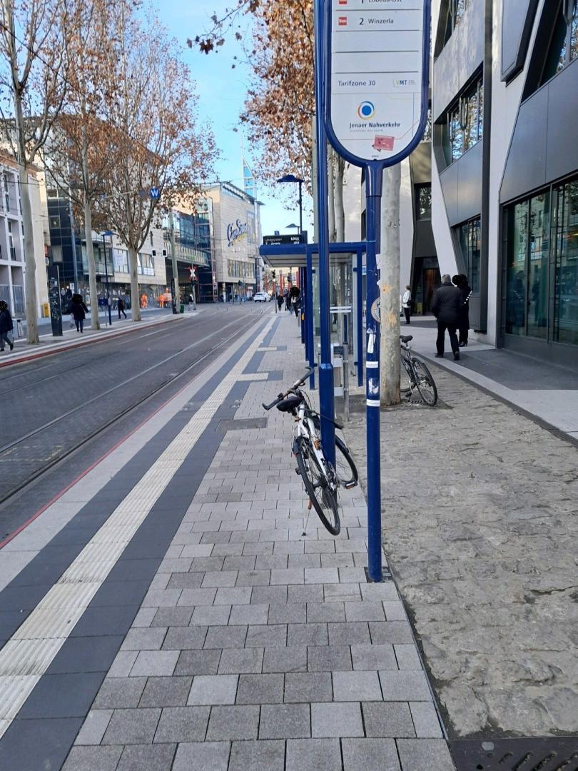 Siehe Bilder. Ein Kontrolle vor Ort ergab keinen Handlungsbedarf. Es werden nur wenige Fahrräder außerhalb von Fahrradständer abgestellt. Dies ist z. B. an Laternen grundsätzlich zulässig! Behinderungen oder Einschränkungen, insbesondere das Bodenleitsystem für Blinde und seheingeschränkte Personen ist frei. Zusatzinformation: Der Fachdienst Kommunale Ordnung der Stadt Jena entfernt Fahrräder grundsätzlich nur, wenn diese eine Gefahr darstellen, Wege versperren und eine Umsetzung nicht möglich ist oder wenn offensichtlich ist, dass es sich um ein Schrottfahrrad handelt, an dem das Eigentum bewusst aufgegeben wurde.