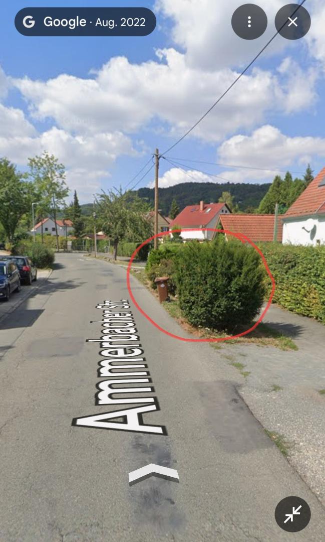 Markierter Bewuchs ist schon viel größer als auf dem Screenshot und ragt ins Lichtraumprofil der Straße.