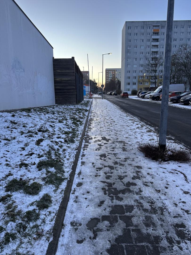 Es wird auf die Regelungen zum Winterdienst verwiesen: https://ksj.jena.de/system/files/2025-12/winterdienst_gehwege_2025-2026.pdf In diesem Fall liegen Anliegerpflichten vor. Der Eigentümer wird auf diese Pflichten hingewiesen. FD Kommunale Ordnung