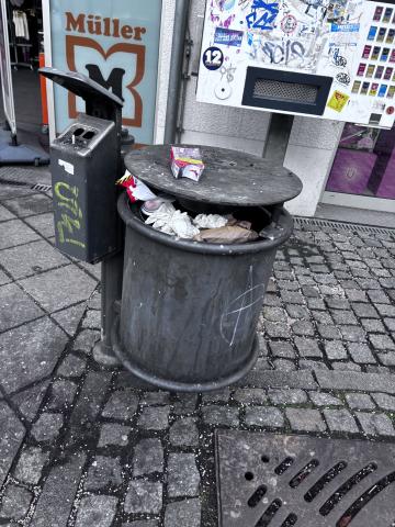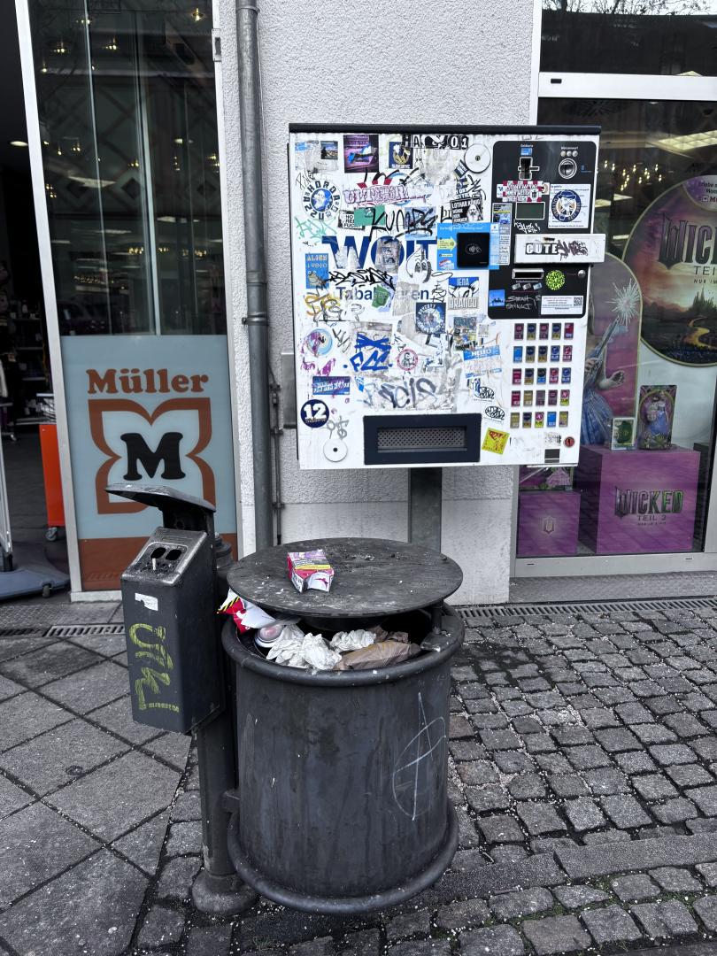 Bereich um den Mülleimer und vorm Zigarettenautomat sieht immer wieder megaräudig aus, Mülleimer oft überfüllt, dreckig - ohnehin ist diese Form nicht gut zu benutzen, ohne sich selbst dreckig zu machen. Unhygienisch.
