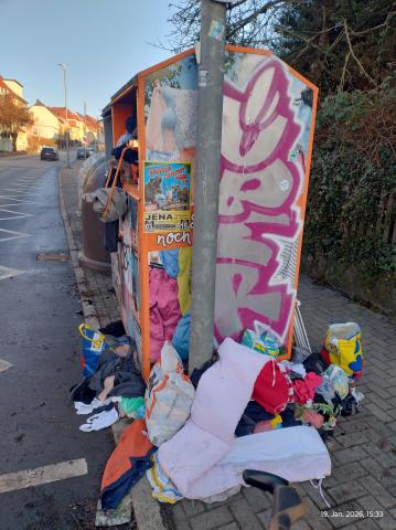 Beschreibung des Mangels Textilkontainer läuft über Bilder des Mangels Details des Mangels Kategorie Müll Status Geschlossen Abteilung Elektroschrott, Altkleidercontainer, Sondermüll Geokoordinaten 50.932008, 11.6072153 50.932008, 11.6072153 Anmerkungen / Status Änderungen 19.01.2026 - 15:35 Der Mangel "#19782-2026" wurde gemeldet. 20.01.2026 - 08:00 Zeitnahe Entleerung und Beräumung des Platzes um die Altkleidercontainer. 20.01.2026 - 08:00 Der Status des Mangels "#19782-2026" wurde von "Gemeldet" zu "Geschlossen" geändert. 20.01.2026 - 08:00 Die Kommentarfunktion wurde deaktiviert. Kommentare