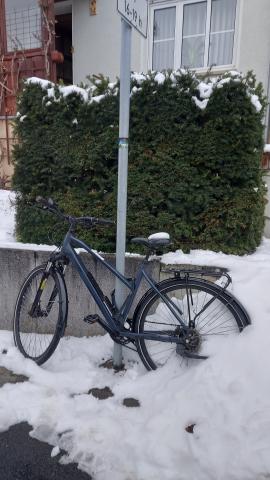 Dieses Fahrrad ist seit ca. 3 Monaten an dem Verkehrsschild angeschlossen. Vom Besitzer scheint kein Interesse mehr zu bestehen. Es wäre schön wenn es entfernt werden könnte.