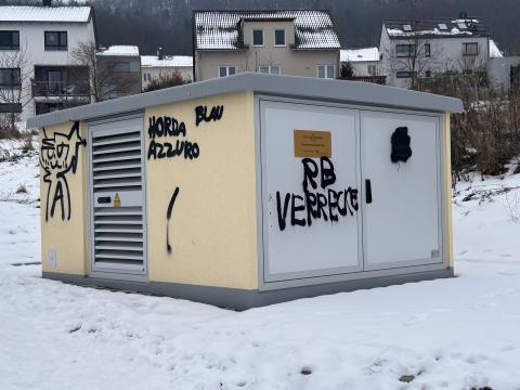 Beschreibung des Mangels Graffiti am neu gebauten Trafohäuschen. Bilder des Mangels Details des Mangels Kategorie Graffiti Status Gemeldet Abteilung Verkehrsleiteinrichtungen, Parkraum, Graffitientfernung Geokoordinaten 50.929583216617, 11.592758932465 50.929583216617, 11.592758932465 Anmerkungen / Status Änderungen 05.02.2026 - 13:21 Der Mangel "#19950-2026" wurde gemeldet. Kommentare You must have JavaScript enabled to use this form. Ihr Name Betreff Kommentar Hilfe zum Textformat Klartext Keine HTML-Tags erlaubt. Zeilenumbrüche und Absätze werden automatisch erzeugt. Website- und E-Mail-Adressen werden automatisch in Links umgewandelt.