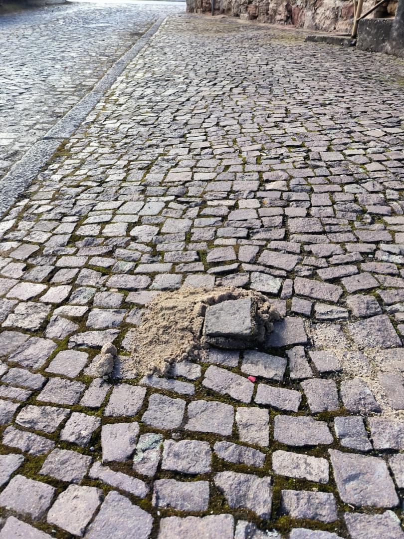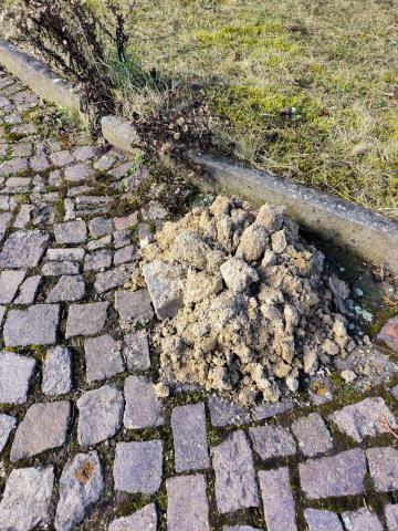 Pflastersteine an mehreren Stellen (siehe Beispielbild) gelöst, wahrscheinlich durch Maulwurf hervorgerufen. Stolper-/Unfallgefahr.
