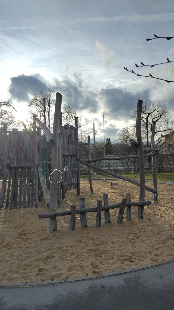 An einem der Pfeiler der Holzspielburg auf dem Spielplatz Ringwiese ist ein Hakenkreuz angebracht worden. Der entsprechende Pfeiler wurde auf dem 2. Foto markiert.