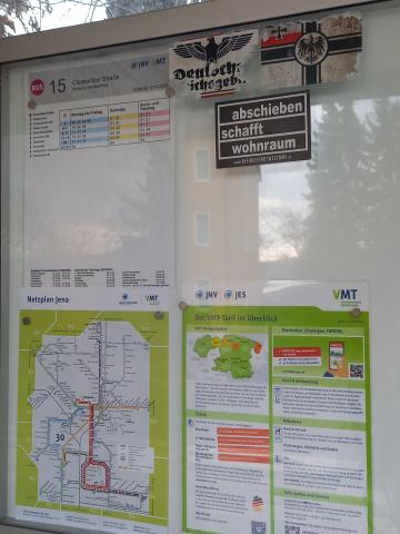 hiermit möchte ich Sie auf rechtspolitische Werbung an der Bushaltestelle "Closewitzer Straße", Linie 15, Jena Nord, aufmerksam machen.