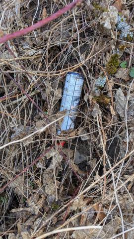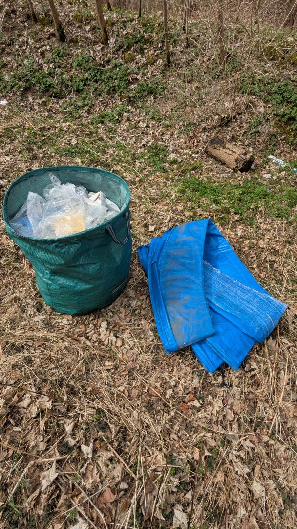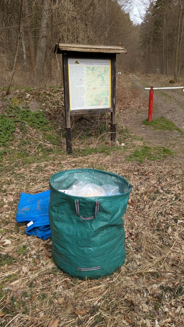 Müllablagerungen an Parkplatz B7 links hinter Carl-August Richtung Isserstedt, Stand 28.03.2026: grüner Plastesack mit Inhalt und blaue Plasteplane vor Infotafel I031, einzelner Müll (Sprayflaschen) vor und hinter Erdwall; Bitte entfernen.