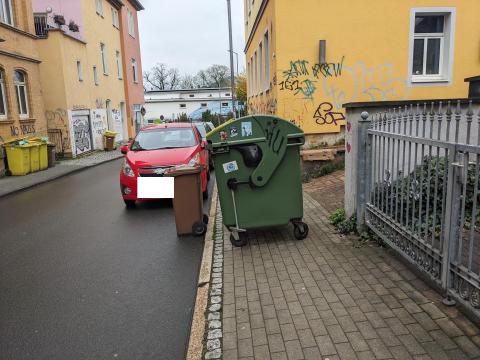 Große Mülltonne versperrt seid dem 13.4 den ganzen Fußweg, mit Kinderwagen oder Rollstuhl ist dort kein Vorbeikommen.