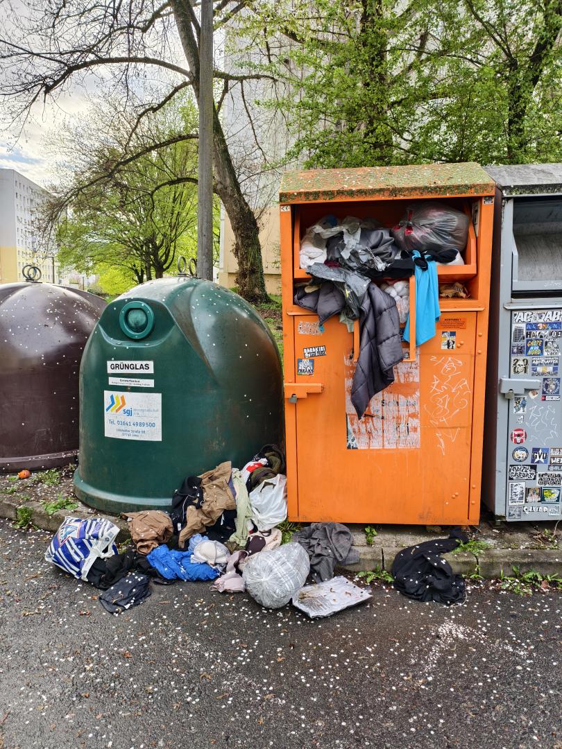 Beschreibung des Mangels Alt Kleidercontainer überfüllt Bilder des Mangels Details des Mangels Kategorie Müll Status Gemeldet Abteilung Elektroschrott, Altkleidercontainer, Sondermüll Geokoordinaten 50.889298545611, 11.612024364175 50.889298545611, 11.612024364175 Anmerkungen / Status Änderungen 19.04.2026 - 18:41 Der Mangel "#20695-2026" wurde gemeldet. Kommentare You must have JavaScript enabled to use this form. Ihr Name Betreff Kommentar Hilfe zum Textformat Klartext Keine HTML-Tags erlaubt. Zeilenumbrüche und Absätze werden automatisch erzeugt. Website- und E-Mail-Adressen werden automatisch in Links umgewandelt.