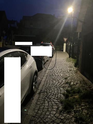 Seit geraumer Zeit hat der Anwohner eine Konstruktion installiert und lädt sein E-Auto über den öffentlchen Bürgersteig hinweg. Man kann an dem Kabel welches über dem Gehweg hängt hängen bleiben und sich verletzten. Es handelt sich hier um ein Hochspannungskabel. Potentiell Lebensgefährlich!