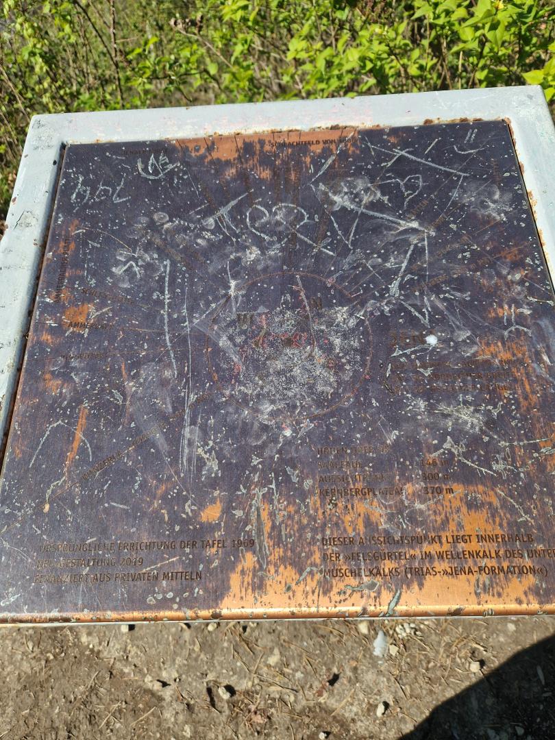 Beschreibung des Mangels Die s.g. Kupferplatte an der Saalehorizontele (oberhalb der Sophienhöhe) ist schon lange nicht mehr lesbar. Sie müsste dringend gereinigt werden !!! Bilder des Mangels Details des Mangels Kategorie Stadtwald/Wanderwege Status Gemeldet Abteilung Stadtforstverwaltung Geokoordinaten 50.917580177431, 11.600172387504 50.917580177431, 11.600172387504 Anmerkungen / Status Änderungen 22.04.2026 - 18:19 Der Mangel "#20729-2026" wurde gemeldet. Kommentare You must have JavaScript enabled to use this form. Ihr Name Betreff Kommentar Hilfe zum Textformat Klartext Keine HTML-Tags erlaubt. Zeilenumbrüche und Absätze werden automatisch erzeugt. Website- und E-Mail-Adressen werden automatisch in Links umgewandelt.