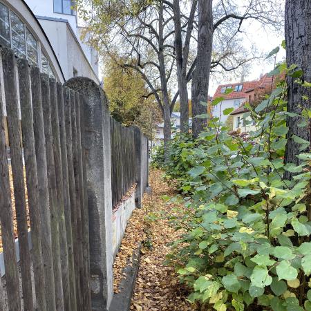 Am Fußweg finden Bauarbeiten statt; Fußgänger sollen ausweichen. Jedoch ist der Fußweg auf der anderen Straßenseite nicht gut nutzbar, der Weg ist schlammig bzw. mit viel Laub versehen und Büsche wuchern den Weg zu. Für Kinderwagen und Co. nicht nutzbar. Zusätzlich ist dies ein durch Grundschüler häufig frequentierter Weg, da sich in der Nähe die Nordschule befindet.