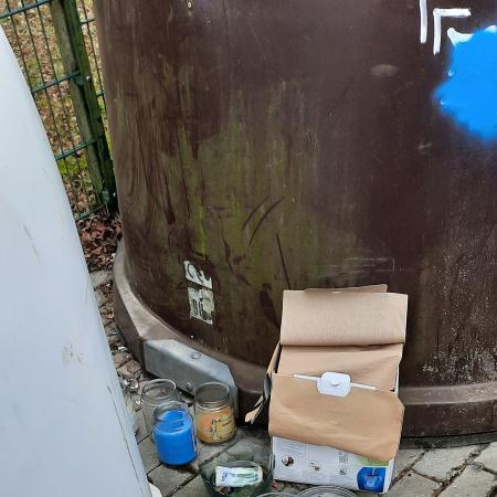 Die 4 Gläser mit dem Kerzenwachs stehen mind. 14 Tage dort. Ich verstehe nicht, dass zB am Montag nach der Leerung der Altkleider mal der Müll umliegend mit genommen wird. Das gehört doch auch dazu, die Glasabholer hätten es meiner Meinung nach sowieso tun müssen. So verleitet es den nächsten Müll daneben zu stellen.