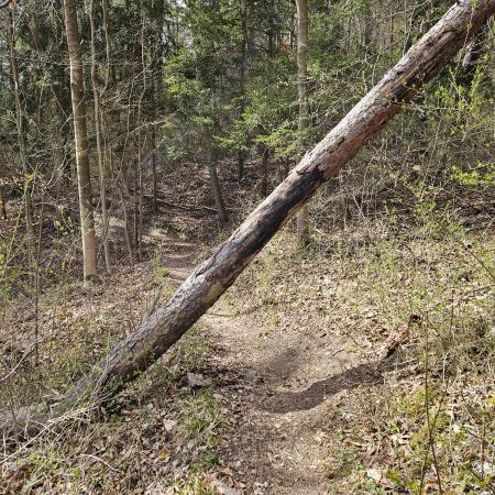 Kernberge, obere Horizontale,blau, liegt dieser Baum über dem Wanderweg. Er ist nicht zu umgehen und mit Mühe zu überklettern. Liegt etwa 100m von der Slawischen Wallanlage entfernt. Bitte bei nächster Gelegenheit entfernen. Danke.