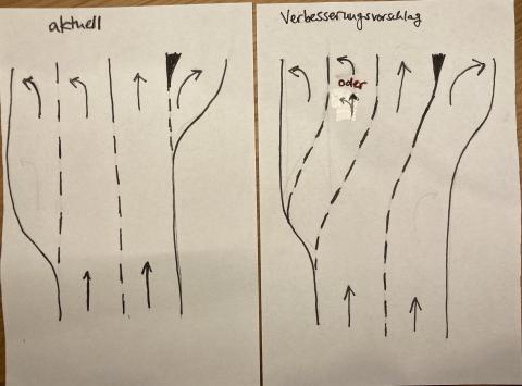 Meiner Meinung nach könnte eine einfache Änderung der Spurführung/Um-Markierung hier eine deutliche Verbesserung des Verkehrsflusses und Vermeidung gefährlicher Spurwechselmanöver erzielen. (Siehe Foto.)