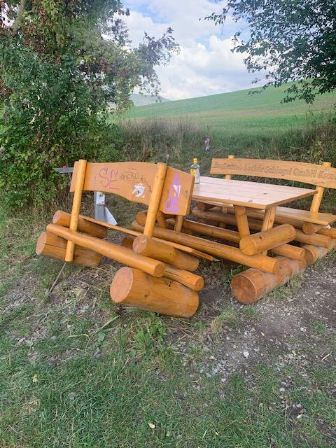 Auf dem Rastplatz zwischen Erlkönig und Kunitz (oberer Weg) ist eine Bank aus der Verankerung gerissen (Vandalismus).