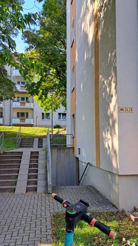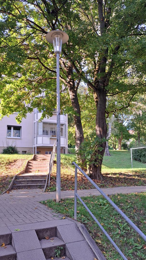 Die Laterne (Foto 2) an der Treppenanlage (von Haltestelle Altenburger Str. bis hinauf zur Schützenhofstraße) am Standort neben dem Hauseingang Friedenstr. 69 ist defekt. Ich bin gestern dort gegen 20 Uhr im Dunkeln hinauf gelaufen und finde es sehr gefährlich.
