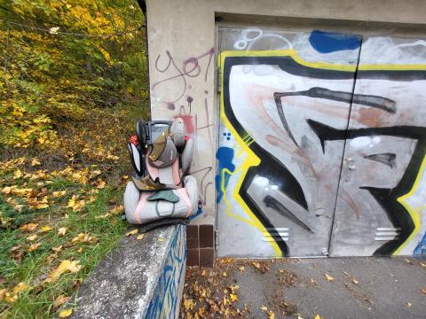 Dieser Kindersitz steht hier schon seit mindestens 1 Jahr. Jetzt fällt er langsam auseinander. Der wird also bestimmt nicht mehr gebraucht und kann weg....