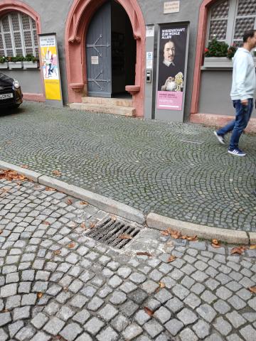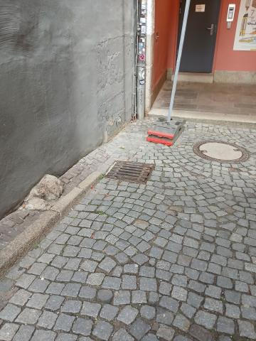 Im Bereich vor Markt 7, "Göhre" und "An der Marktmühle" sind 2 Gullis verstopft. Bei dem oberen wurden nach Bauarbeiten an der Merkur Bank am 16.10.25 Putz- und Mörtelreste eingeleitet. Bei künftigen Starkregenereignissen könnten angrenzende Gebäude, bzw. deren Keller, geschädigt werden.