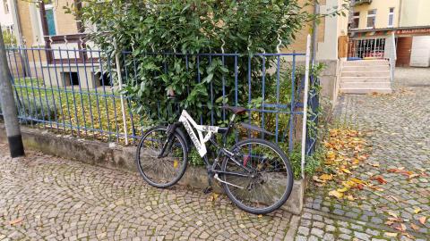 Seit mehreren Wochen steht dieses Fahrrad angeschlossen an unserem privaten Gartenzaun ohne das es bewegt wird