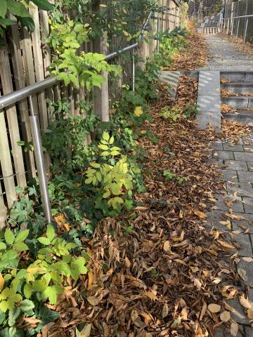 Der Magaretenweg in Jena-Ost liegt voller Blätter, die Kinderwagenspur ist kaum noch zu sehen,weiterhin wachsen am Rand Eschen (bisher sind sie noch relativ klein, aber nicht mehr lange).