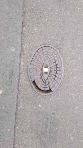 Beschädigter scharfkantiger Unterflurhydrantendeckel in der Straße.