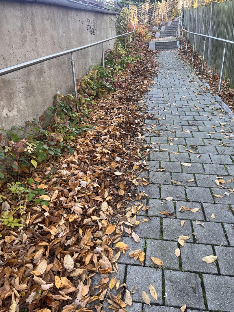 den Gehweg kann man hier aufgrund von Blättern und Gestrüpp nicht mehr mit dem Kinderwagen passieren. Ich muss jetzt seit mehreren Wochen einen Umweg gehen. Bitte um freiräumen/-schneiden des Gehwegs.