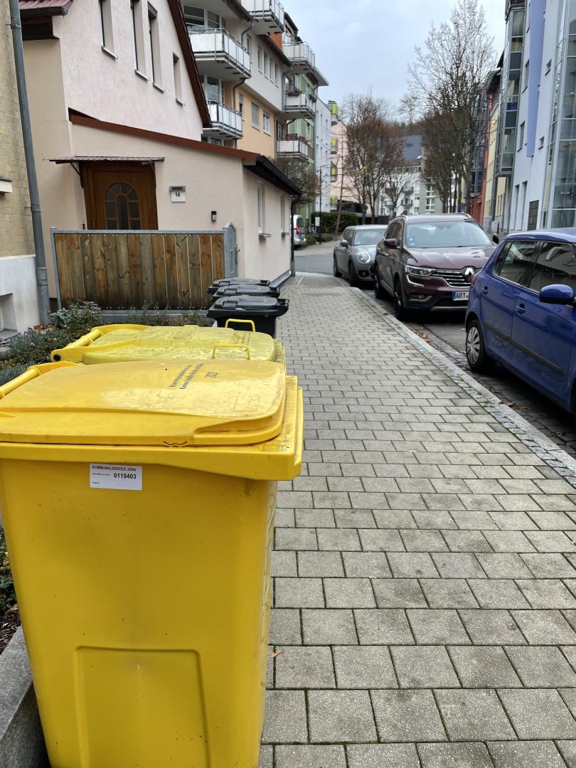 Offensichtlich wurden die Müllbehälter der Schenkstraße 16 bei der Behälterleerung am Donnerstag (gelb) und am Freitag (Restmüll) "übersehen", während die Papierbehälter abgeholt wurden. Auch der Rest der Route scheint abgeholt worden zu sein