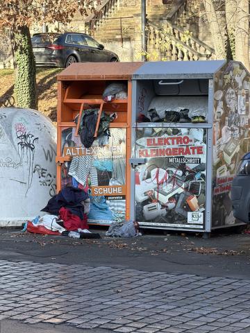 Beschreibung des Mangels Überfüllter Altkleidercontainer Bilder des Mangels Details des Mangels Kategorie Müll Status Gemeldet Abteilung Elektroschrott, Altkleidercontainer, Sondermüll Geokoordinaten 50.931285504775, 11.578384272064 50.931285504775, 11.578384272064 Anmerkungen / Status Änderungen 16.11.2025 - 12:16 Der Mangel "#19180-2025" wurde gemeldet. Kommentare You must have JavaScript enabled to use this form. Ihr Name Betreff Kommentar Hilfe zum Textformat Klartext Keine HTML-Tags erlaubt. Zeilenumbrüche und Absätze werden automatisch erzeugt. Website- und E-Mail-Adressen werden automatisch in Links umgewandelt.