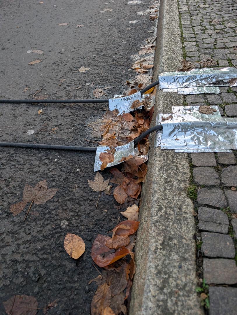 Auf dem Fußweg und auf der Straße in der Jahnstraße Haus 24 queren dicke Elektrokabel. Hier besteht Stolper- und Sturzgefahr.