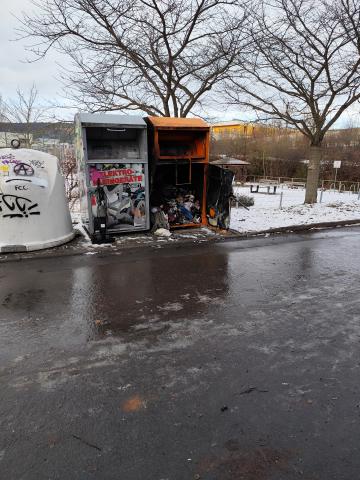 Beschreibung des Mangels Brand eines Kleidercontainers Bilder des Mangels Details des Mangels Kategorie Müll Status Geschlossen Abteilung Elektroschrott, Altkleidercontainer, Sondermüll Geokoordinaten 50.9338411, 11.6055486 50.9338411, 11.6055486 Anmerkungen / Status Änderungen 04.01.2026 - 12:17 Der Mangel "#19559-2026" wurde gemeldet. 06.01.2026 - 08:31 Die Kommentarfunktion wurde deaktiviert. 06.01.2026 - 08:31 Der Status des Mangels "#19559-2026" wurde von "Gemeldet" zu "Geschlossen" geändert. 06.01.2026 - 08:31 Zeitnahe Beräumung durch Kommunalservice Jena Kommentare