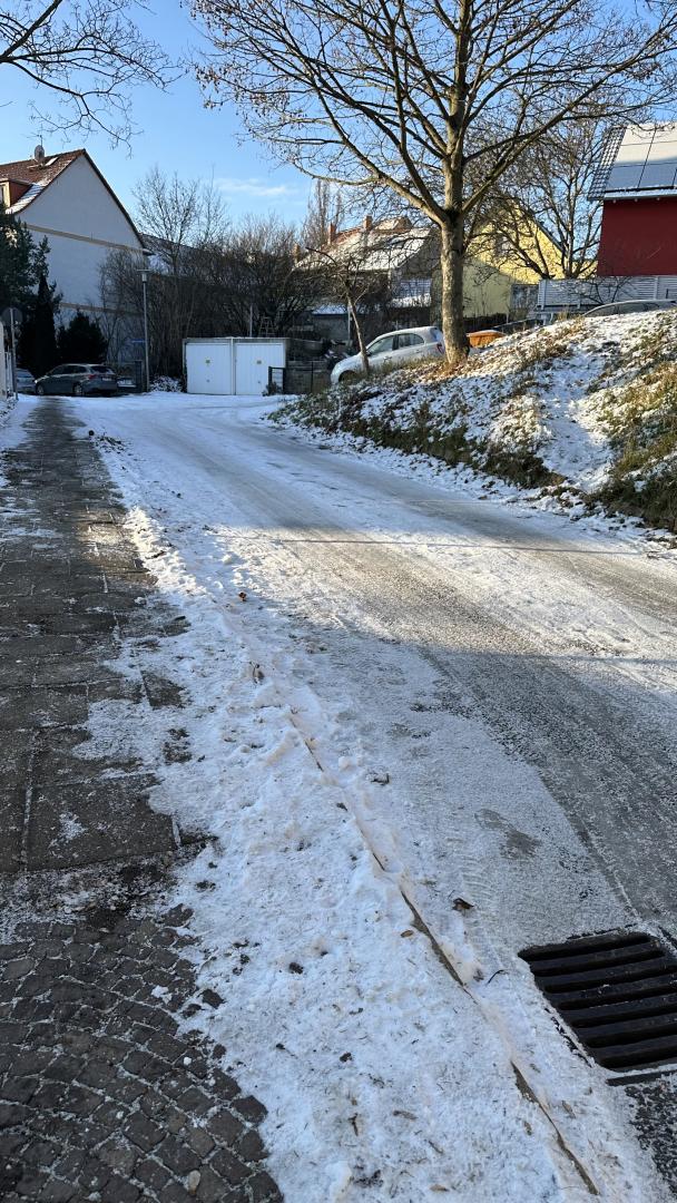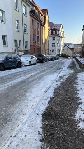 Es wäre angebracht in der Gustav-Fischer-Straße 6 bis zum birnstiel nr 16 die Straße von Glatteis und Schnee zu befreien. (Siehe Bilder). Durch die Glätte verliere ich schon fast die Kontrolle über mein Auto trotz Schrittgeschwindigket. Es ist für Fußgänger ebenso gefährlich und unzumutbar da langzugehen/fahren. Große Verletzungsgefahr!