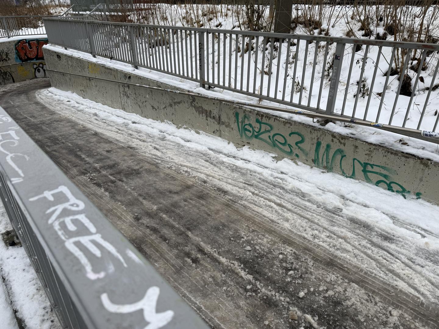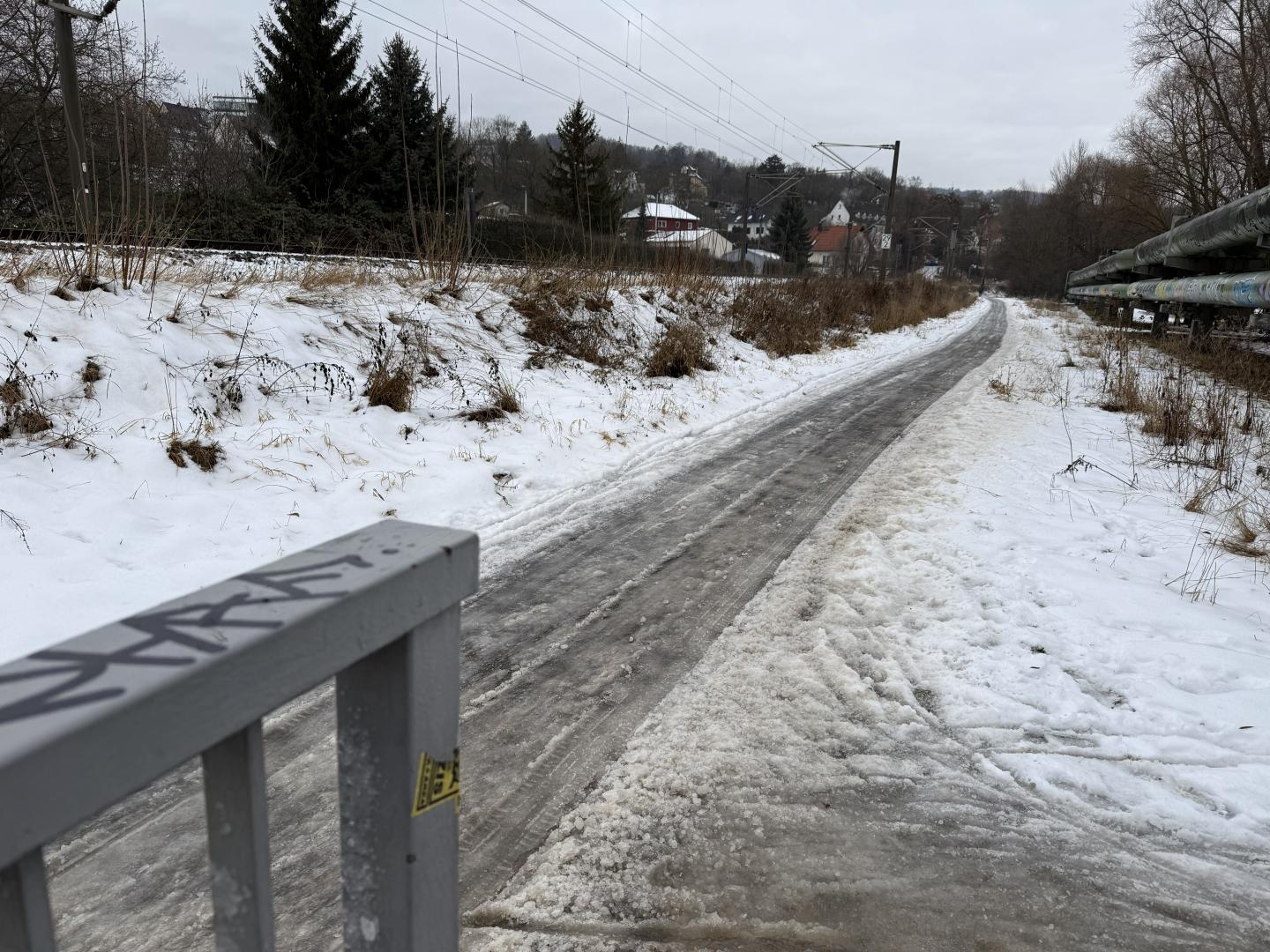 Nun zum Mangel/Frage: Warum wird bei jedweder Aktion (Winterdienst - siehe Fotos von heutiger Eis-und Schneeglätte bis und durch den Tunnel hindurch; Grasmahd im Sommer, Laubbeseitigung im Herbst usw. immer das nördlich des Ringwiesenbahntunnels gelegene Stück des Burgauer Weges nicht berücksichtigt. Und das seit Jahren! Obwohl extrem viel befahren/begangen.