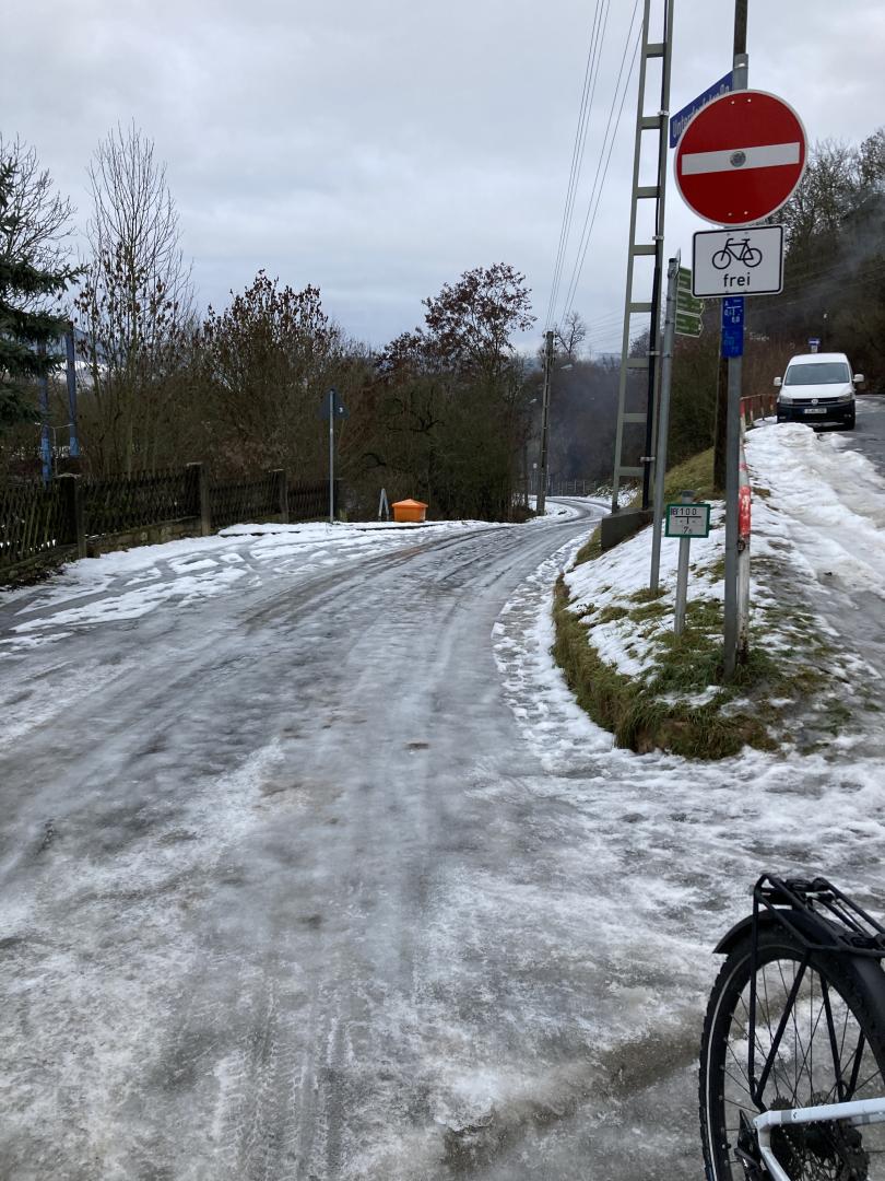 Der Zuweg zur Fußgängerbrücke und zur Bushaltestelle über den Abzweig der Unterdorfstraße von der Wöllnitzer Straße ist auch mehrere Tage nach dem Schneefall weder geräumt noch gestreut. Fußgänger und Radfahrer werden dadurch erheblich gefährdet.