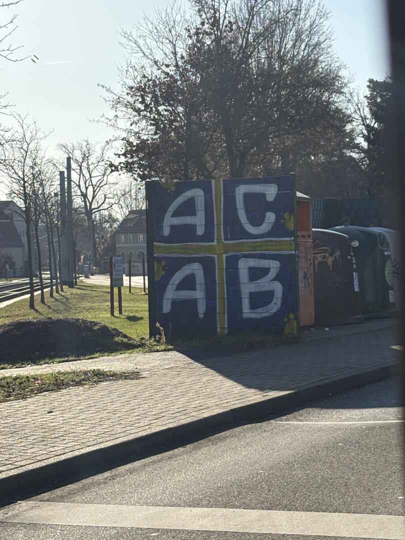 Ein riesiges Grafitto mit dem Polizei-verunglimpfenden „ACAB“ ist schon längere Zeit an der Müllbehälter-Einhausung aufgesprüht und hunderte Fahrgäste der vorbeifahrenden Straßenbahnen und Busse „dürfen“ es in Augenschein nehmen.