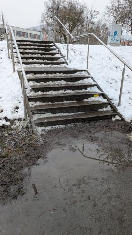 Am Fuß der Treppe, die vom Hofeingang/ausgang der Heinrich-Heine-Schule (Wenigenjenaer Ufer) zum Parkplatz Am Grieß führt, entsteht bei entsprechendem Wetter eine große Pfütze (im aktuellen Foto nicht die maximale Größe). Diese Treppe wird vielfach beim Bringen/Abholen von Schulkindern genutzt. Vielleicht gibt es eine einfache Möglichkeit das trockenzulegen?