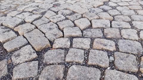 Unsachgemäß gepflasterte Straße nach Glasfaserausbau. Hervorstehende Steine sind Stolperfalle.