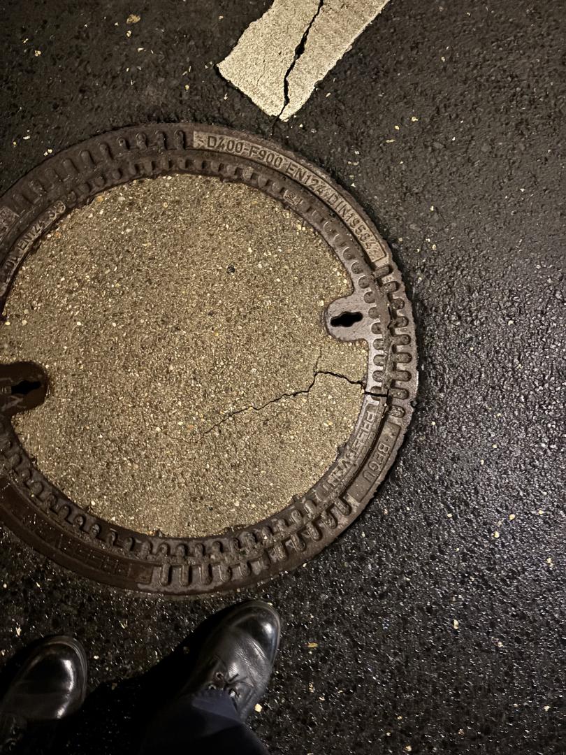 Ampelkreuzung in Lobeda West am Fußgängerampelübergang der Theobald-Renner-Straße ist der Gullideckel gerissen.